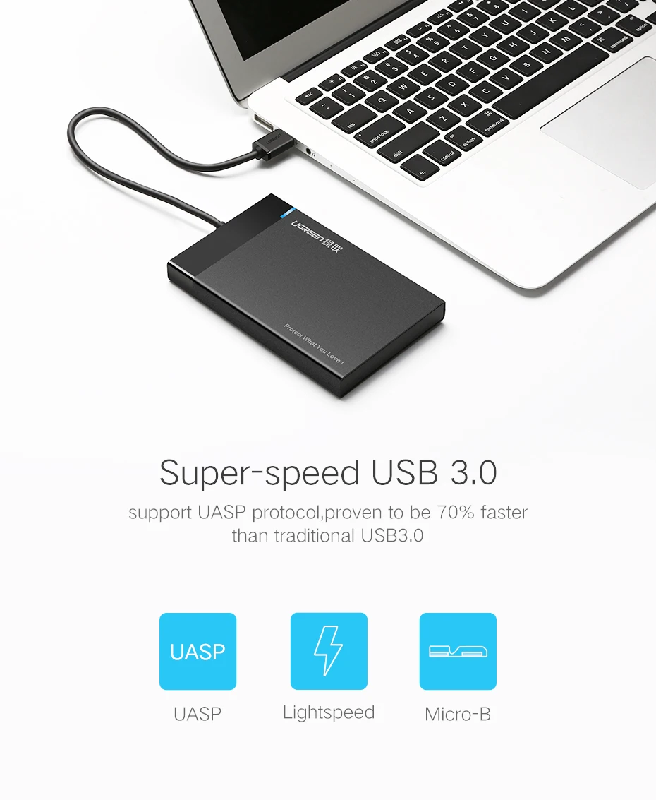 Ugreen 2.5 inch sata HDD to USB 3.0 hard drive enclosure protects your 2.5" HDD and SSD from shaking damage and scratches, and easily connects your hard drive to a PC or laptop for data transfer.